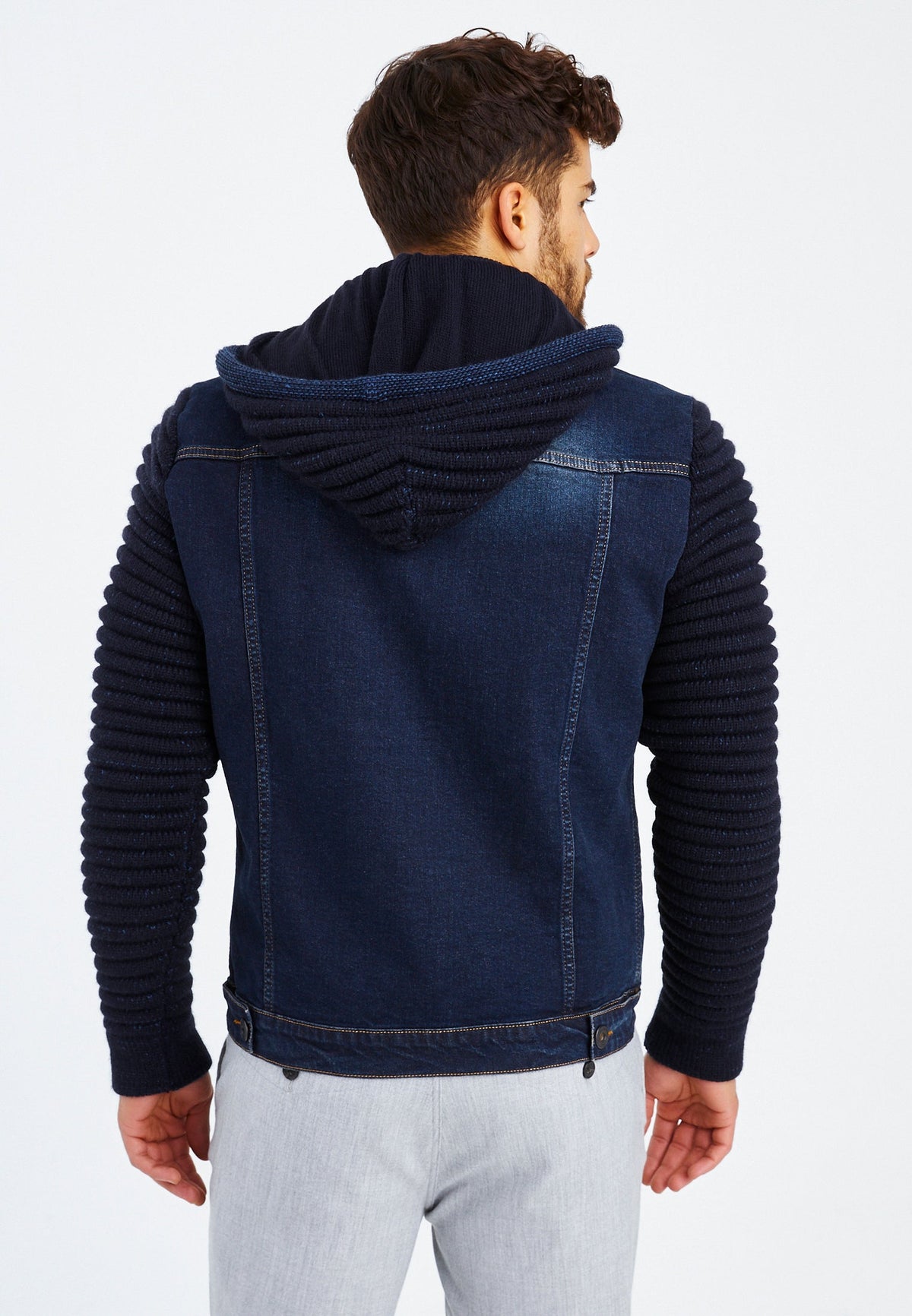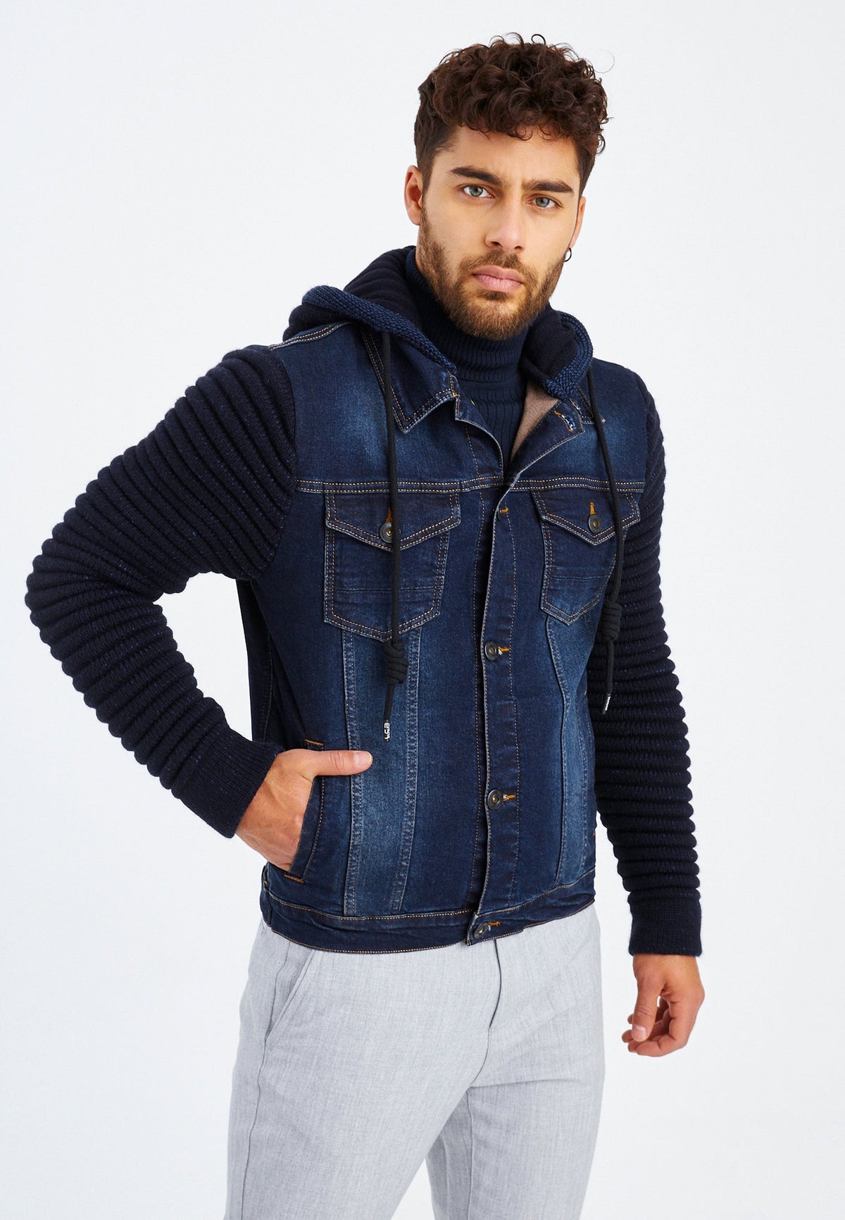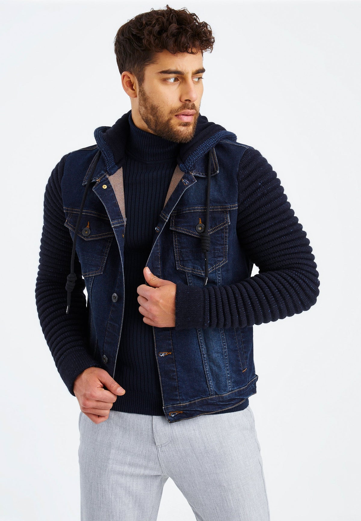 This trendy denim jacket combines the casual look of denim fabric with the warming properties of knit sleeves. The textured knit adds a modern design and extra comfort. The integrated hood and chest pockets complete the urban style perfectly. Ideal for cooler days, this jacket offers a versatile piece that blends style and functionality. Perfect for every fashion-conscious man!