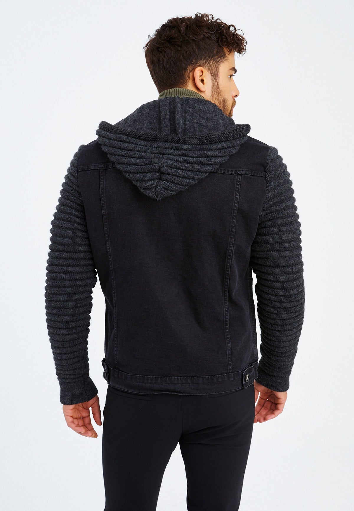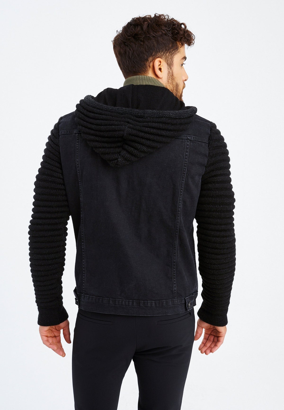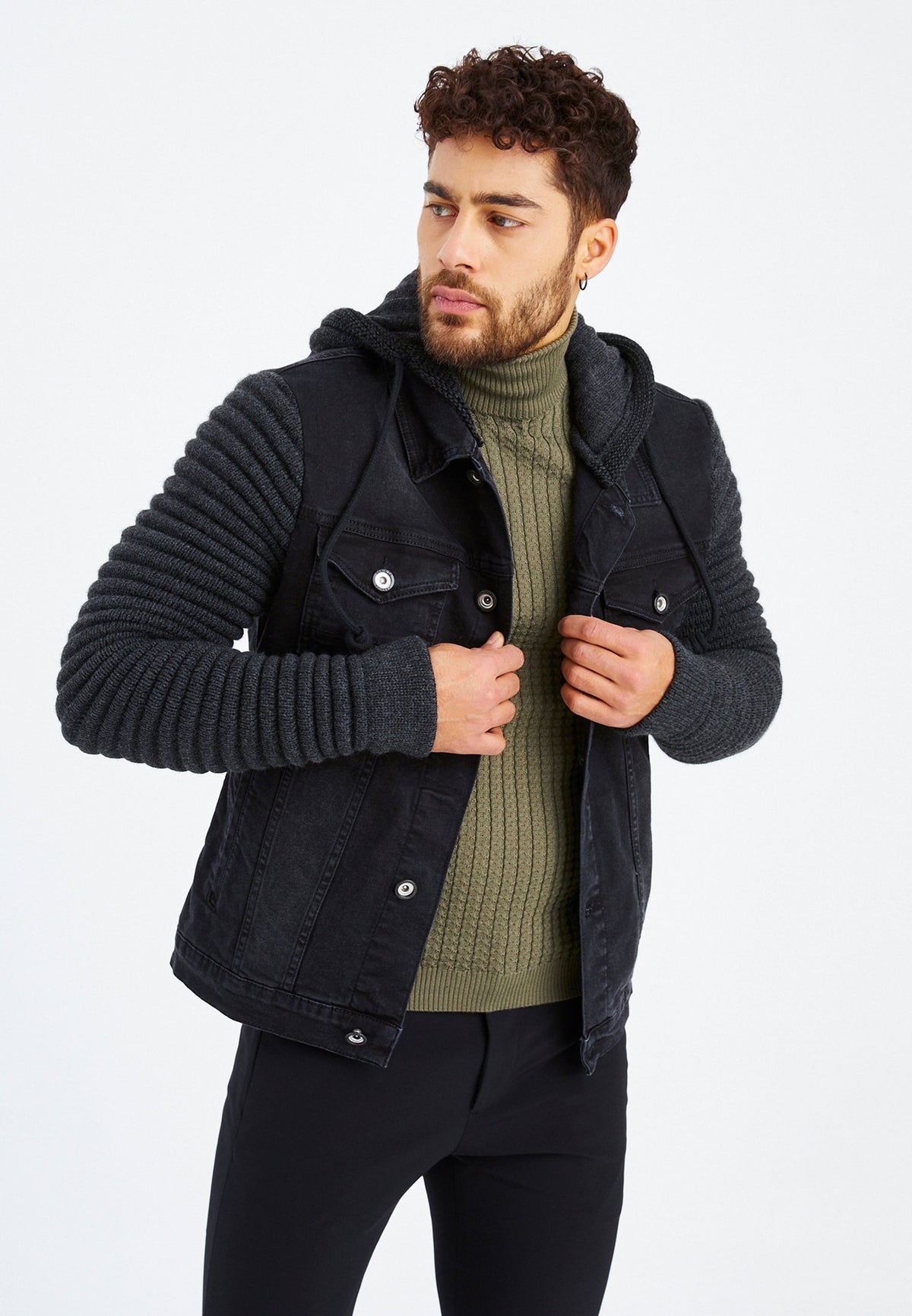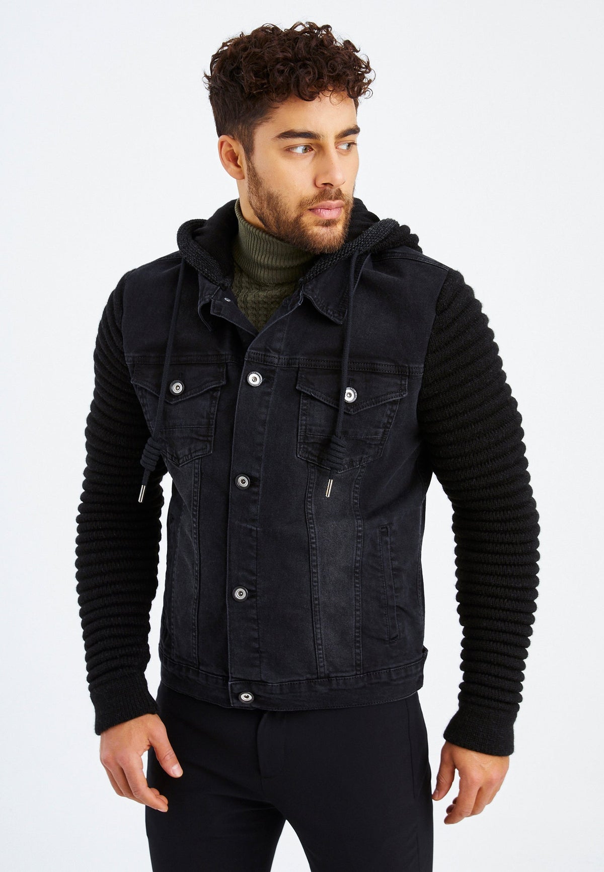 Stylish Denim Jacket With Knit Sleeves And Hood In Black