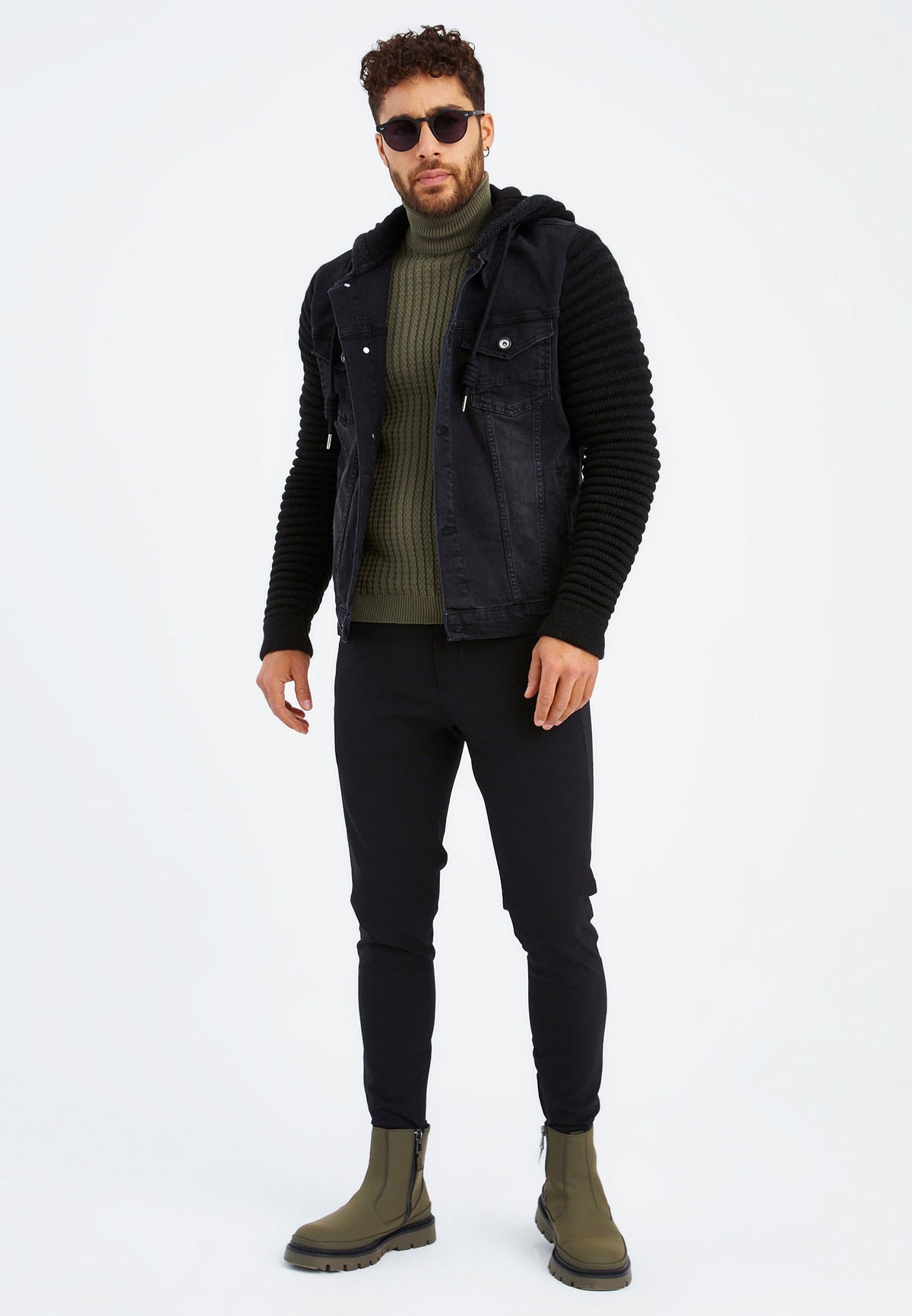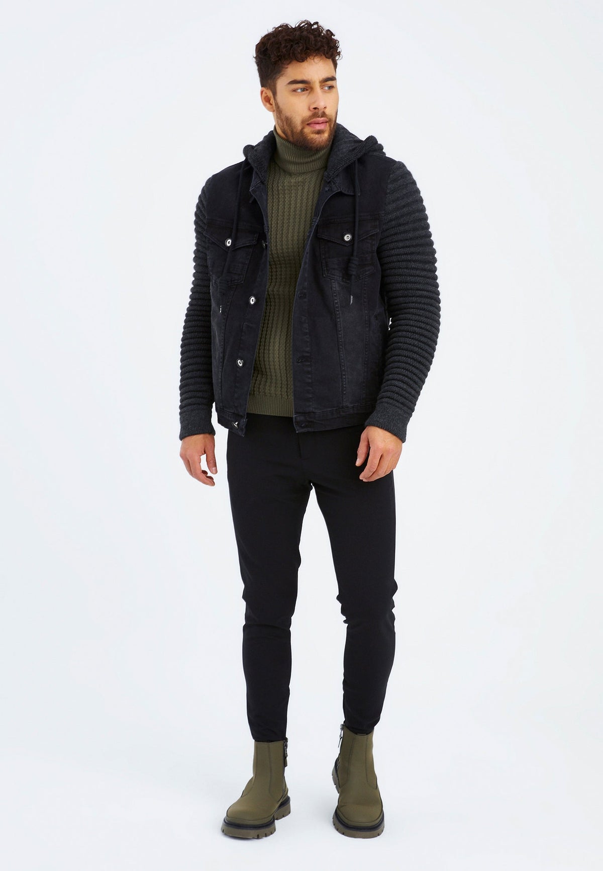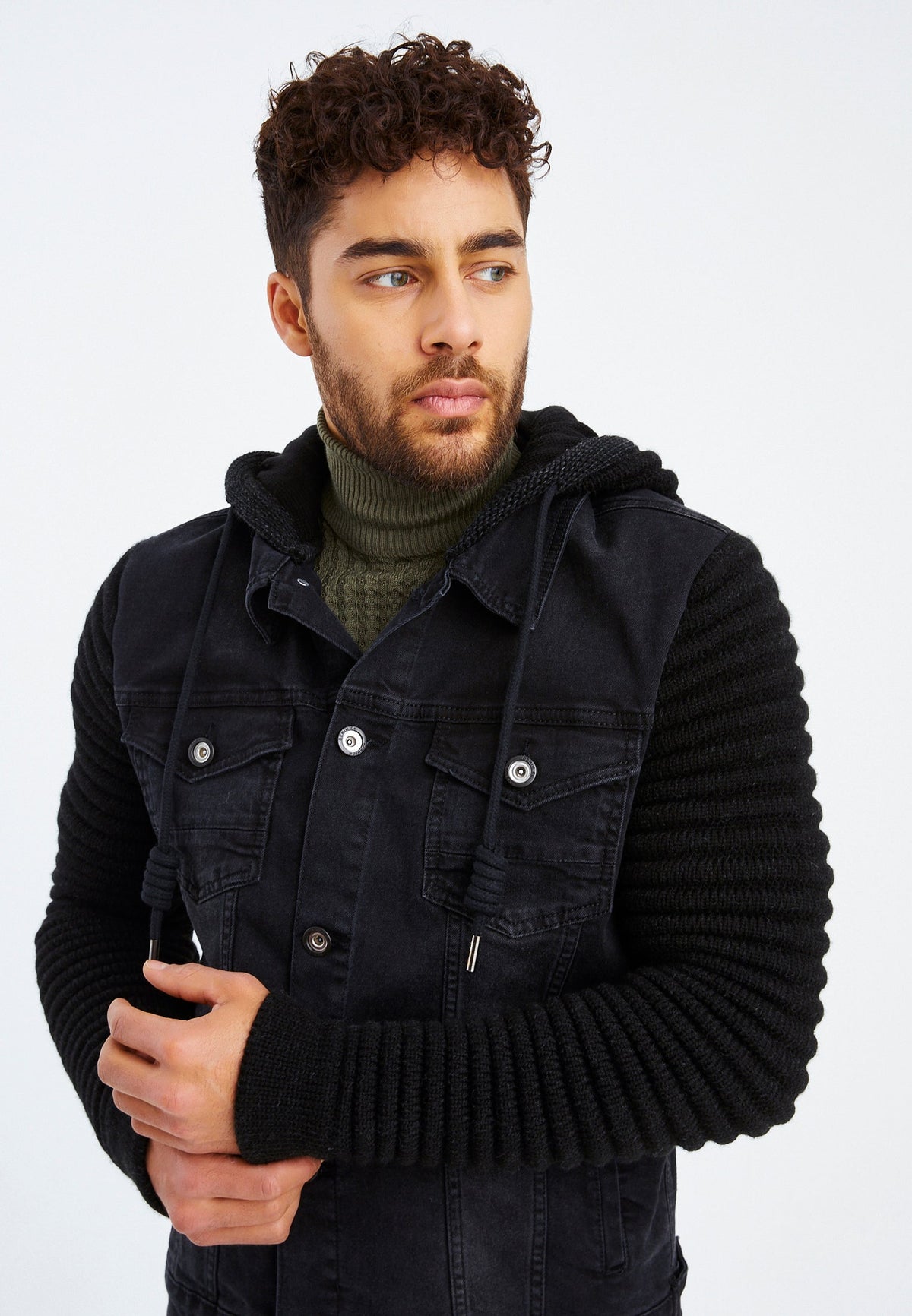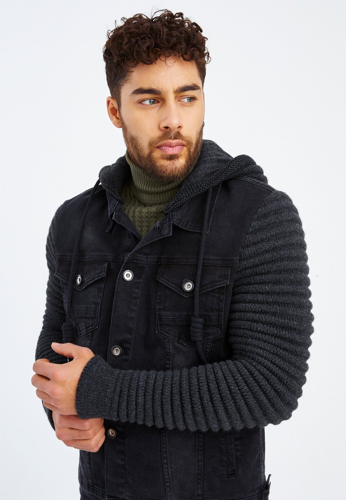 Stylish Denim Jacket With Knit Sleeves And Hood In Black